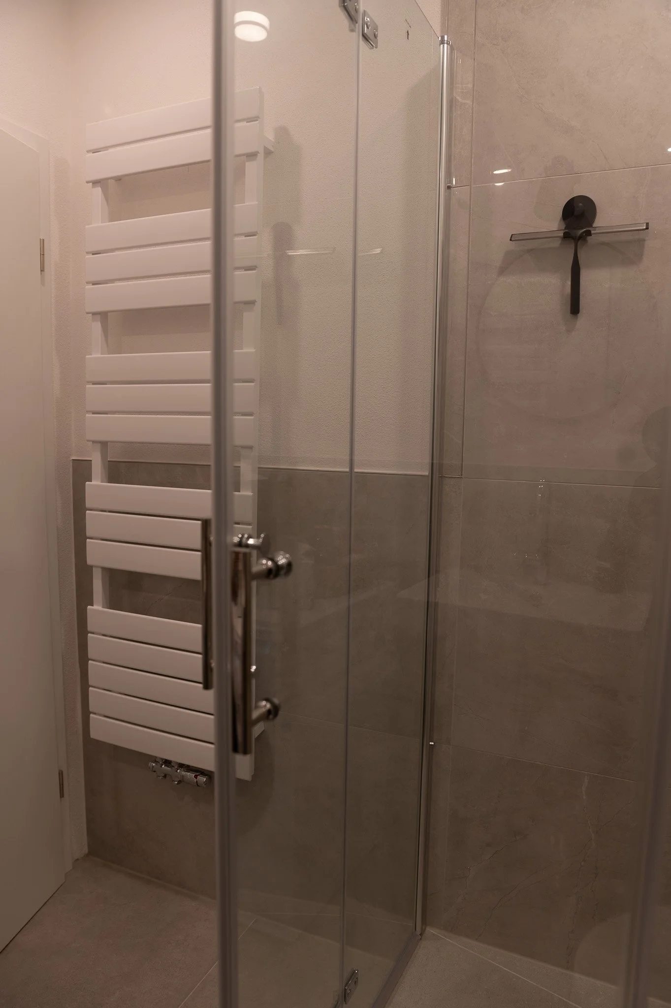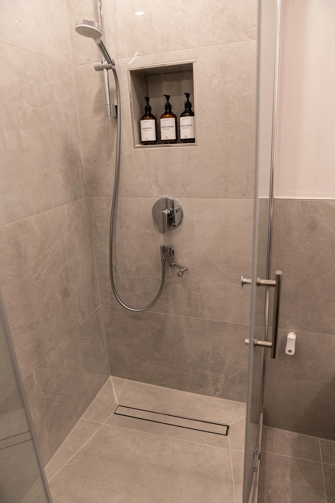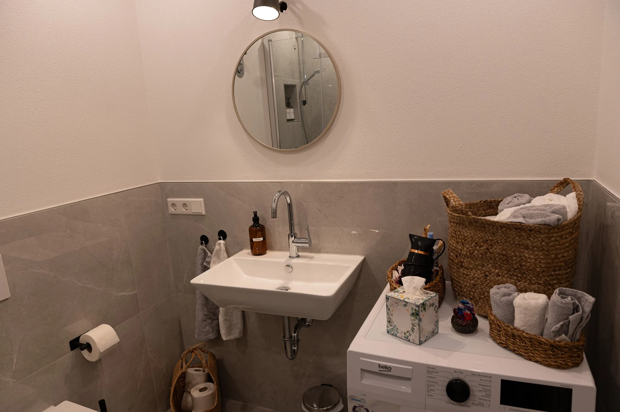 Das Schlafzimmer ist mit einem komfortablen Doppelbett, einer Kommode und einer Kleiderstange ausgestattet. Im Badezimmer erwartet Sie eine moderne Dusche, ein Handtuchwärmer, sowie Waschmaschine und Trockner. Zudem finden Sie dort alles Nötige wie Shampoo, Spülung und Waschmittel - für einen sorglosen Aufenthalt.